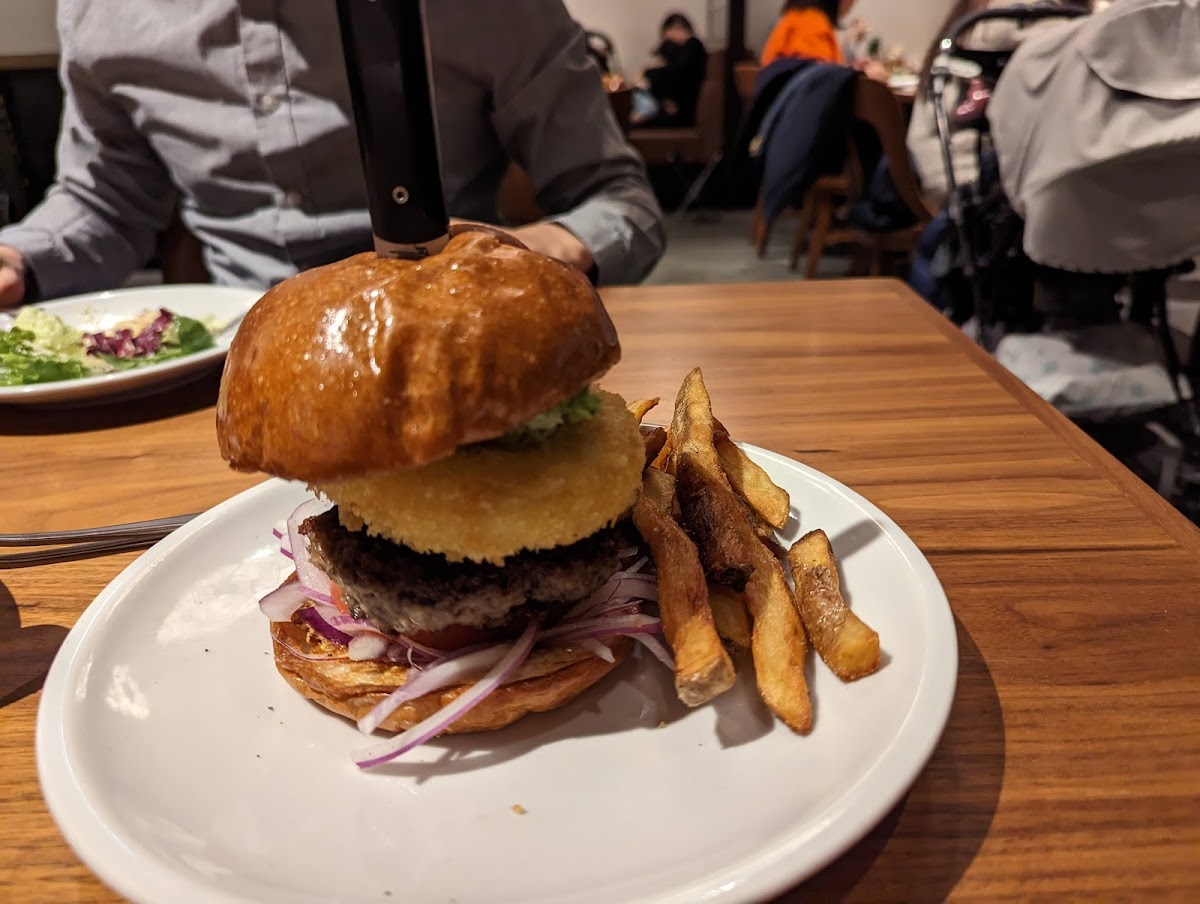 The plain burger was so satisfying. If you like professional burger and like the spacious restaurants without annoying music on , this place is for youIt comes with french fries and roobis tea. Staff are great in terms of hospitality and functionality . Their English is very good. Will definitely come back:)